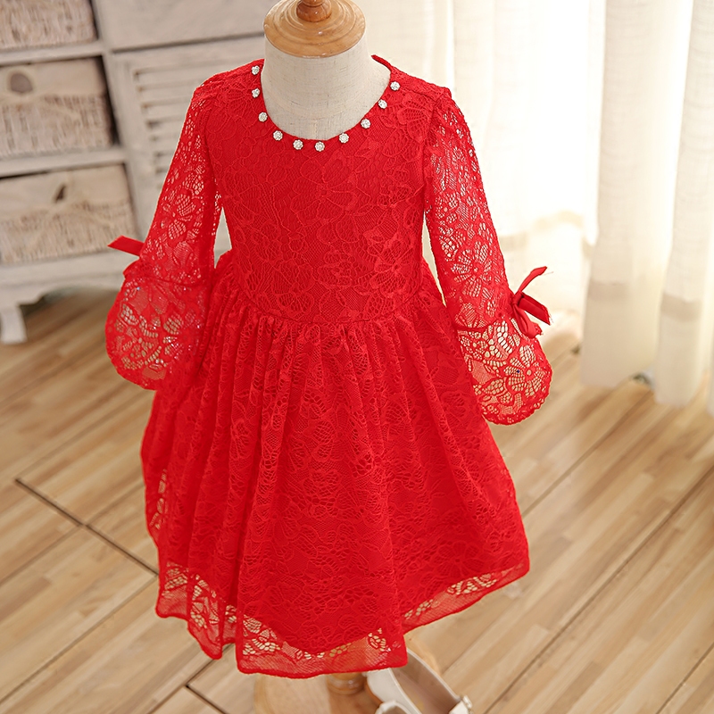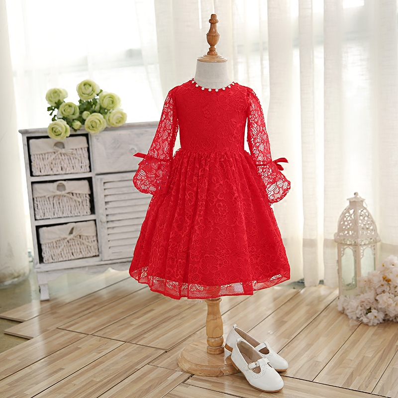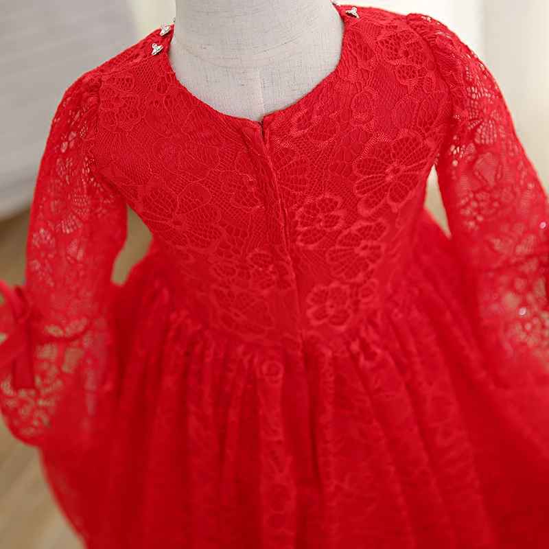 Spring Summer New Elegant Girls Kids Red Color Princess Dresses Korean Style Sweet Lace Eveing Birthday Party Dresses