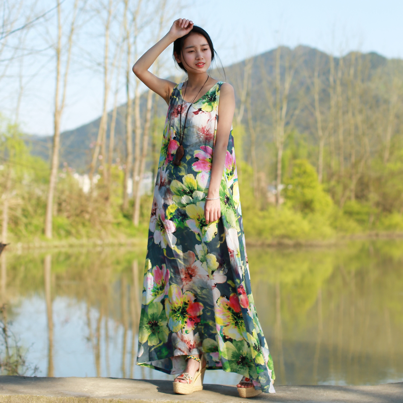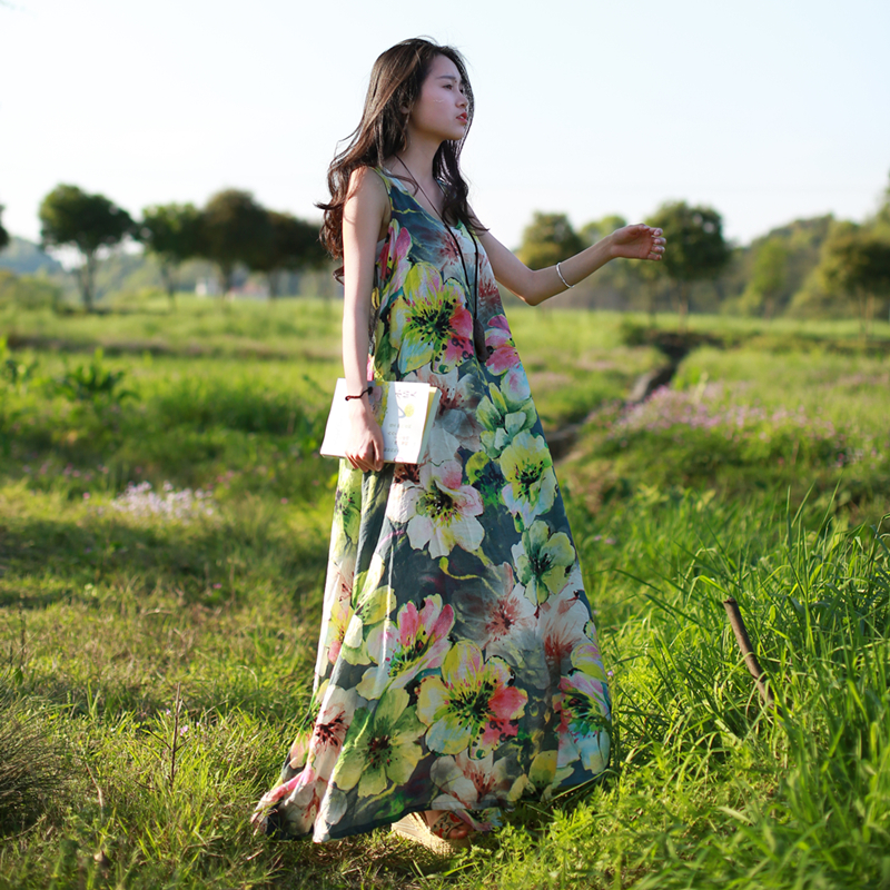Summer Beach Slip Dress Women Maxi Dresses Long Gown Floral Tank Dress Folk Style Sundress Vintage Robe Femme Vestidos