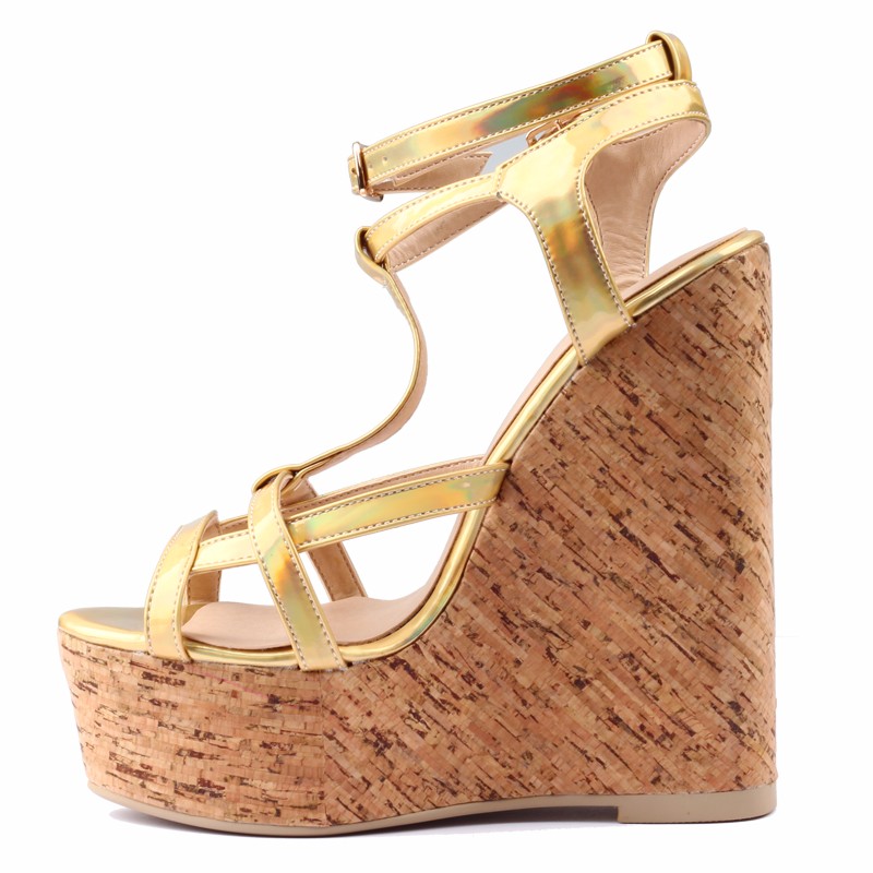 - Item Name: Summer Fashion Wood Grain Patent Leather Ultra High Wedges High Heels Platform Gladiator Sandals Golden Women Shoes