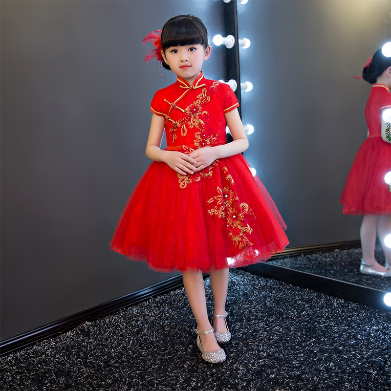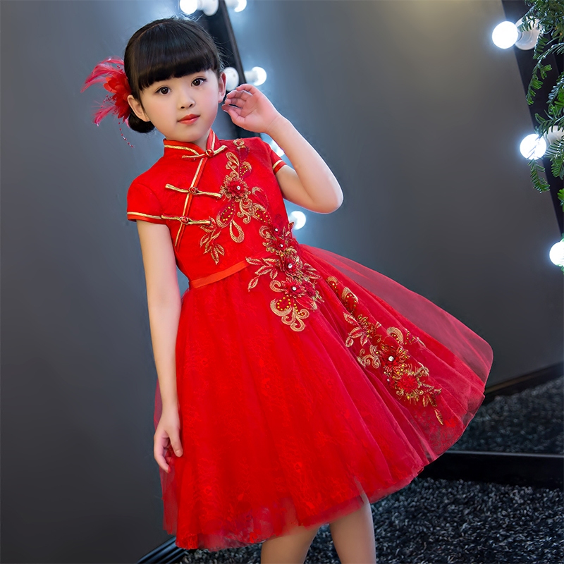 2017New Chinese Traditional Baby Girls Chi-Pao Cheongsam Red Dress New Year Gift Children Clothes Kids Embroidery Party Dresses