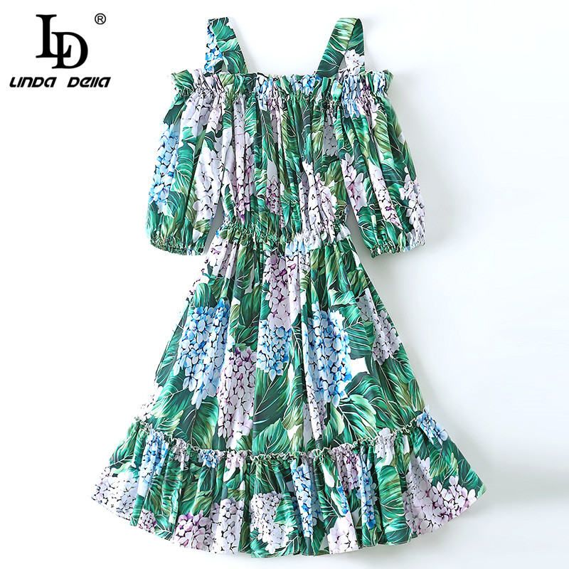 High Quality Fashion Designer Summer Dress Women’s elegant Off the Shoulder Spaghetti Strap Casual Green Floral Print Dress