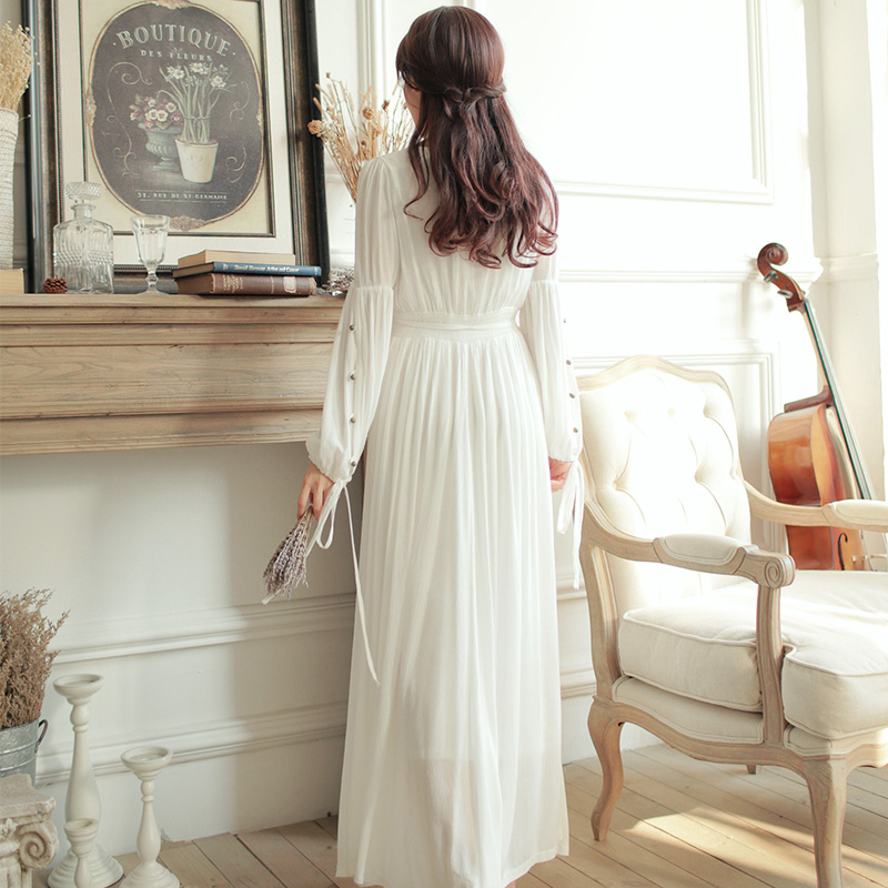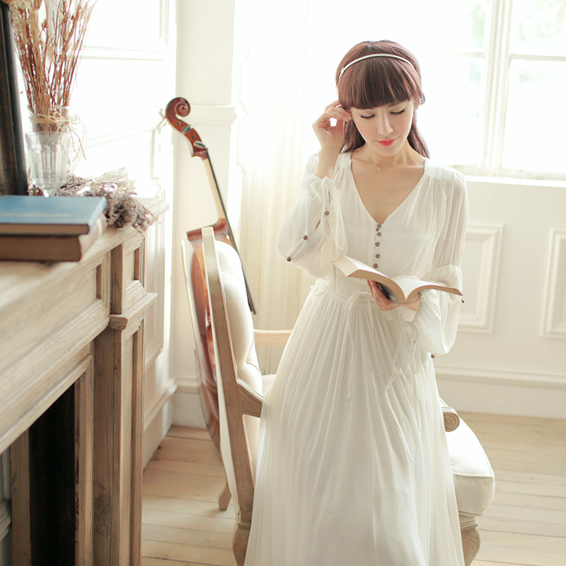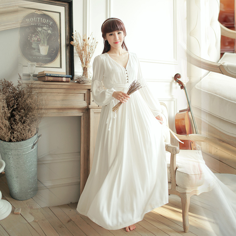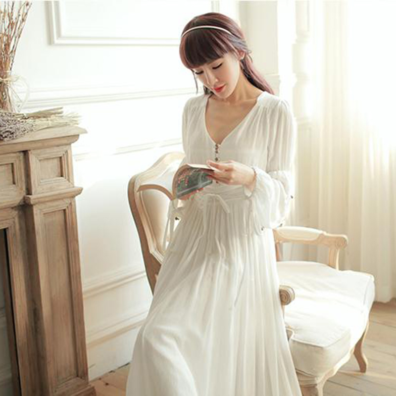 HOT SALE Retro Royal Princess Nightgowns Women White Long Sleeping Dress Sexy V-Neck Cotton Long-Sleeved Nightdress