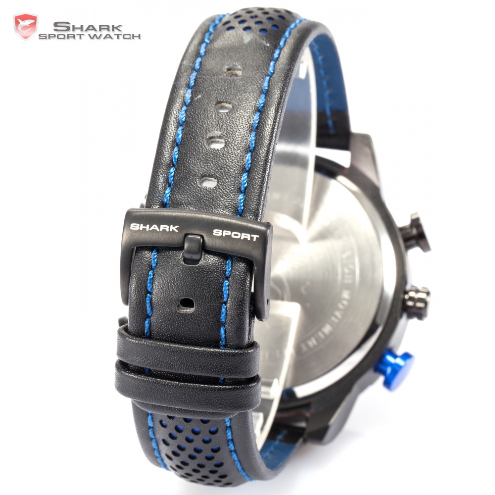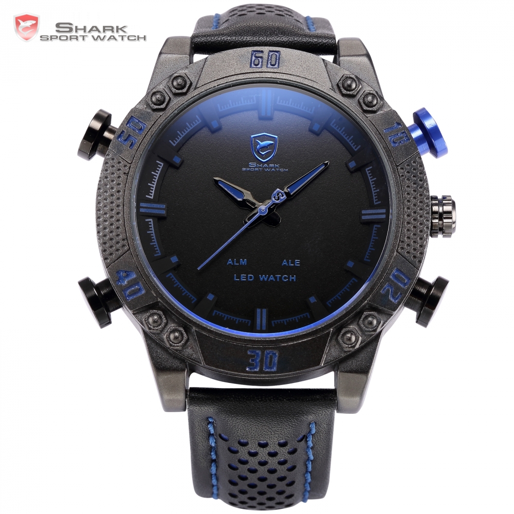Kitefin Shark Sport Watch Blue LED Back Light Auto Date Display Leather Strap Quartz Digital Outdoor Men Military Watches /SH265 Description: – Excellent Hot Racer Watch. Our new watches are a wicked combination of metal and leather that will rock as hard as you! – Red LED is classic, Blue LED is innovation. – Heavy Metal Rim inspired by the vehicle parts Radiator support. – Dual Movement, analog with LED displaying day and date – Alarm setting Main Features: – Kitefin Shark Type A Series – Designed by renowned Japanese Watch Designer “Mr. HitoImachi” – DUAL Movement with the latest breakthrough Japan Quartz Technology – Enable with LED date, day, time Display and alarm function – Water resistant up to 3 ATM – 12 months International Guarantee Specification (approximate) – Case Diameter: 5.0cm (1.97 inch) approx. – Case Thickness: 1.5cm (0.59 inch) approx. – Band Length: 19cm (7.48 inch) approx. – Band Material: Leather – Band Adjustable: Yes Package Included: – 1 x Genuine Shark Sport Watch – 1 x Official Shark Box with Warranty Card