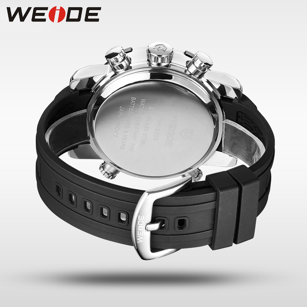 BRAND: WEIDE ITEM: WH5205 STYLE: SPORT,CASUAL,BUSINESS DISPLAY: ANALOG DIGITAL DISPLAY MOVEMENT: ORIGINAL JAPAN MIYOTA 2035 QUARTZ + LCD 3612-13 Feature: – The model (WH5205) with six attractive versions; – Advanced manufacturing technology; – JAPAN MIYOTA 2035 quartz movements; – Special designed with Big Case – High quality PU strap and stainless steel buckle; – Environmental IP Silver or IP black vacuum electroplating case, and pass the ROHS standard; – Watch crown with environmental IPS bronze electroplating; – 30 meters water resistant (Not suitable for swimming, diving, shower etc., please don’t press any keys underwater); – Walking on error ±45S/M. Specification (approximate): Case Diameter: 5.0cm (1.97 inch) approx. Case Thickness: 1.75cm (0.69 inch) approx. Band Length: 21.0cm (8.27 inch) approx. Band Width: 2.4cm (0.94 inch) approx. Components Included: -1 x WEIDE Watch -1 x Users’ Manual -1 x Gift Box Warm reminder: latest package is replacing the former package, now the package will be used randomly.